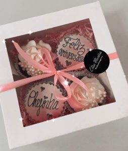 Caixa com laço e 4 cupcakes recheados e personalizados. Embrulho com 6 queques personalizados.