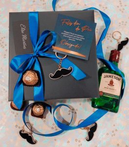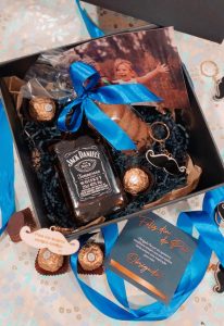 A Man Box vai embrulhada e pronta a entregar. Traz uma garrafa de álcool (5 opções), Ferreros Rocher, bolachas de chocolate caseiras, uma saca com frutos secos variados e uma fotografia pessoal para tornar a vossa box única!
